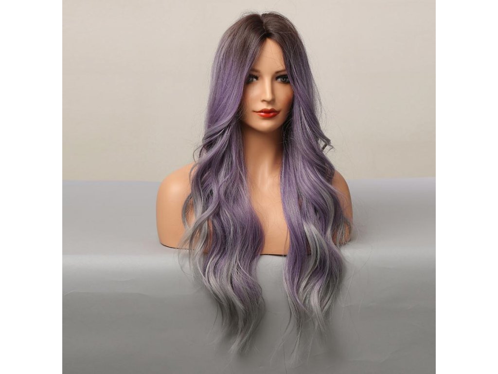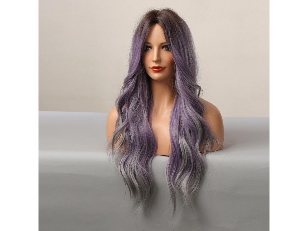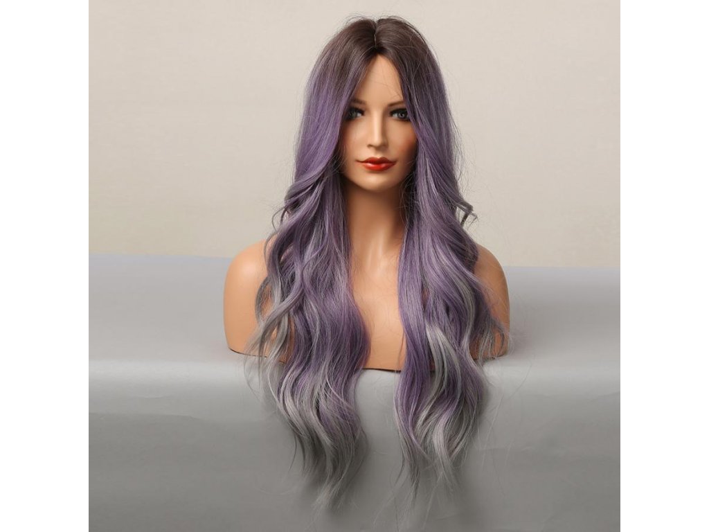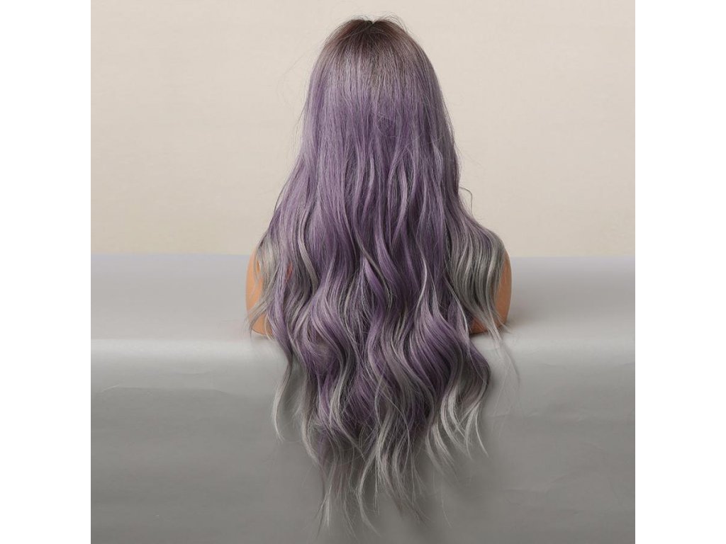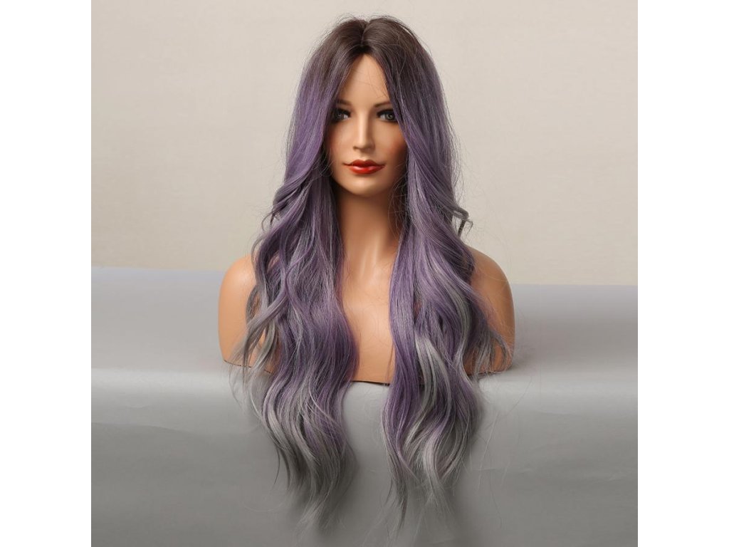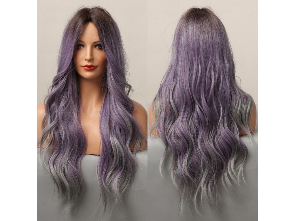 Krásná fialová vlnitá paruka s tmavými kořínky a šedými konečky. Je vyrobena z kvalitních syntetických vláken, které jsou zárukou pohodlného nošení.