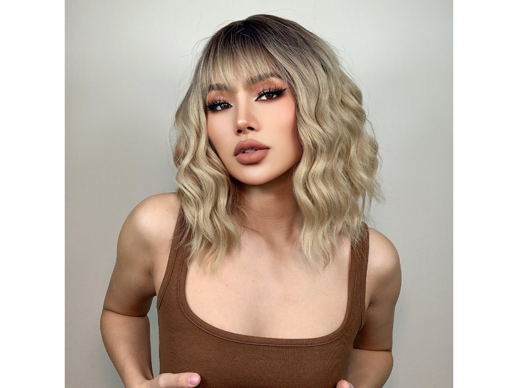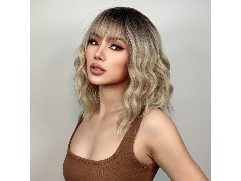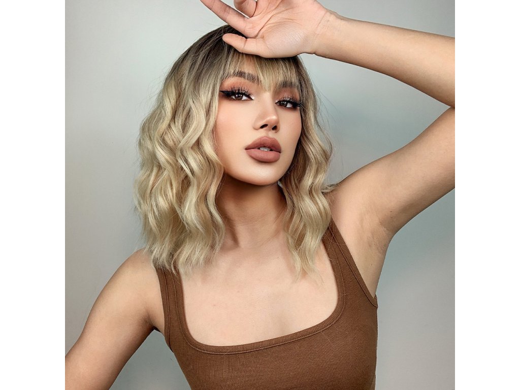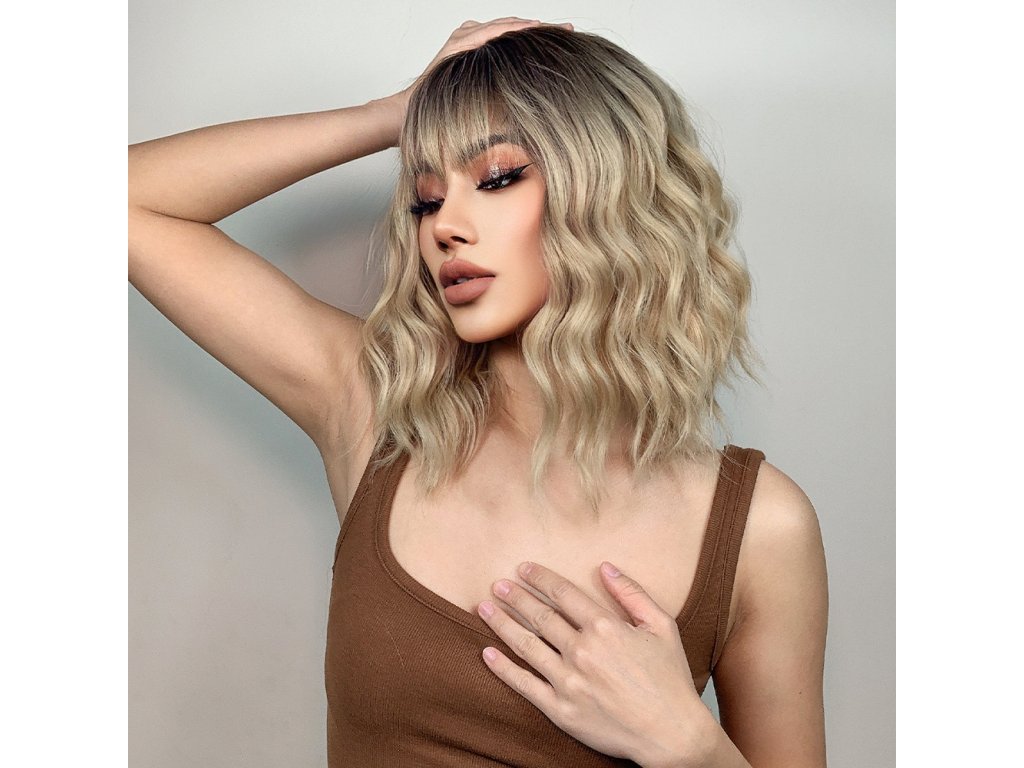 Blond vlnitá krátká paruka Olivie s tmavými kořínky a ofinou