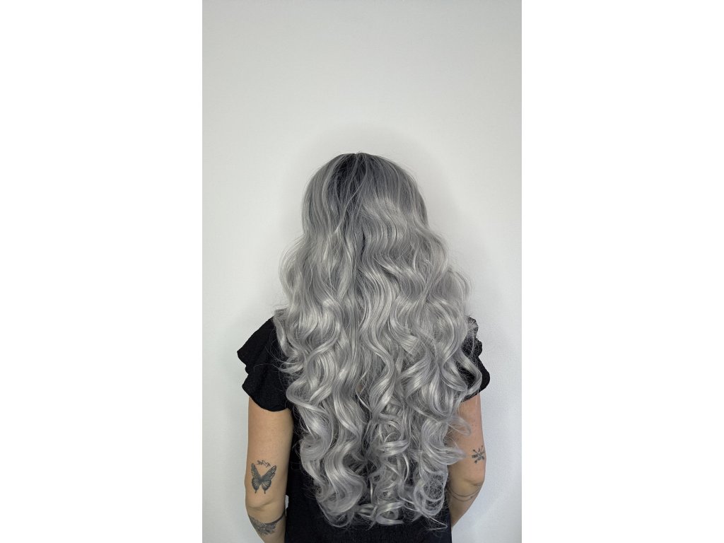 Paruka má situovanou pěšinku lehce na straně. Svěže vypadající blond barva s nádechem fialové se u kořene mění v barvu tmavě hnědých odrostů. Vlasy mají krásně nadýchané kudrliny. Paruka je moderního střihu a působivého vzhledu.