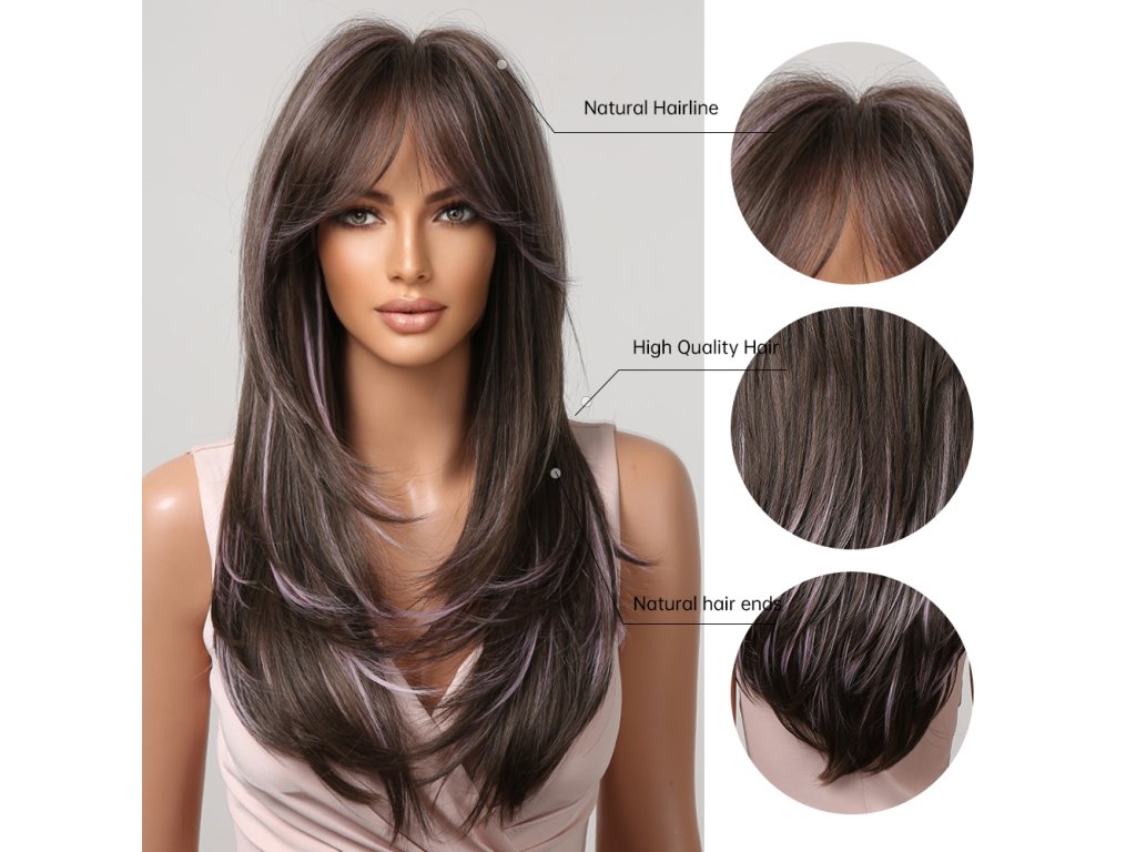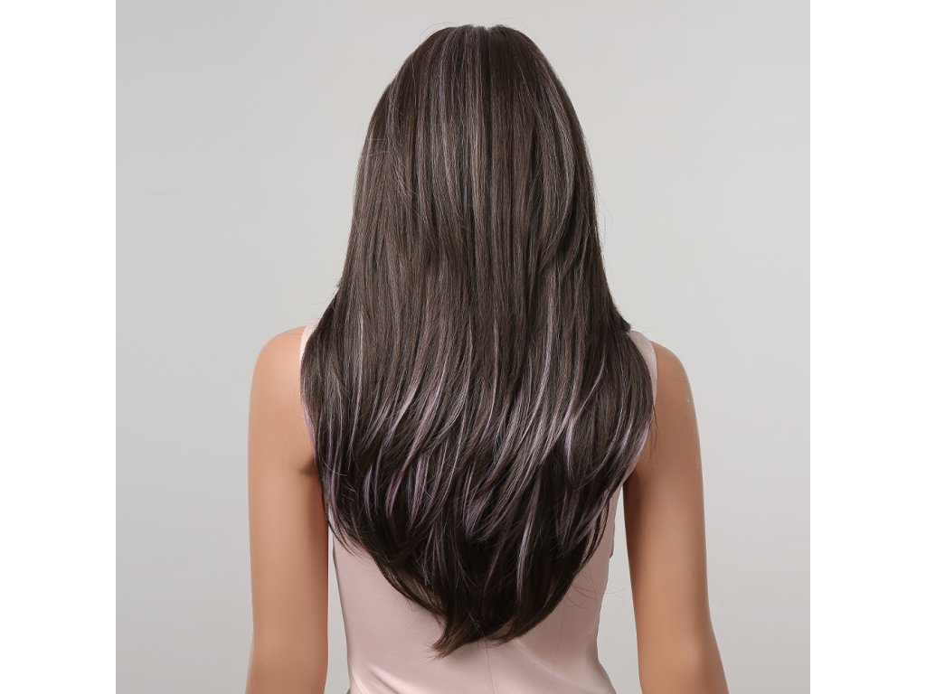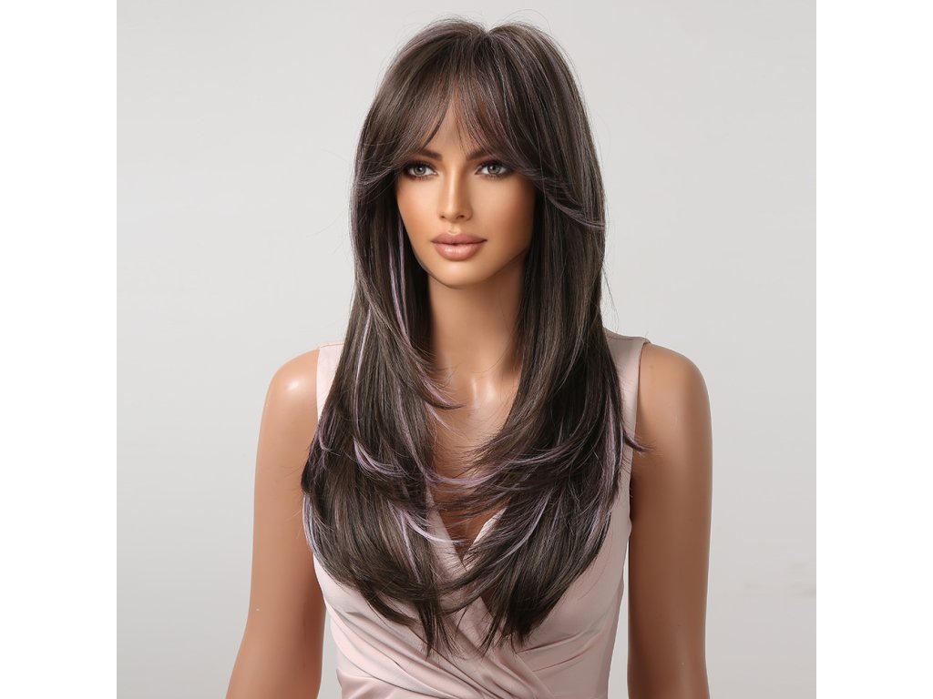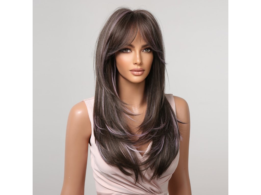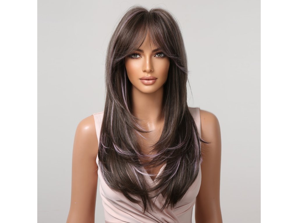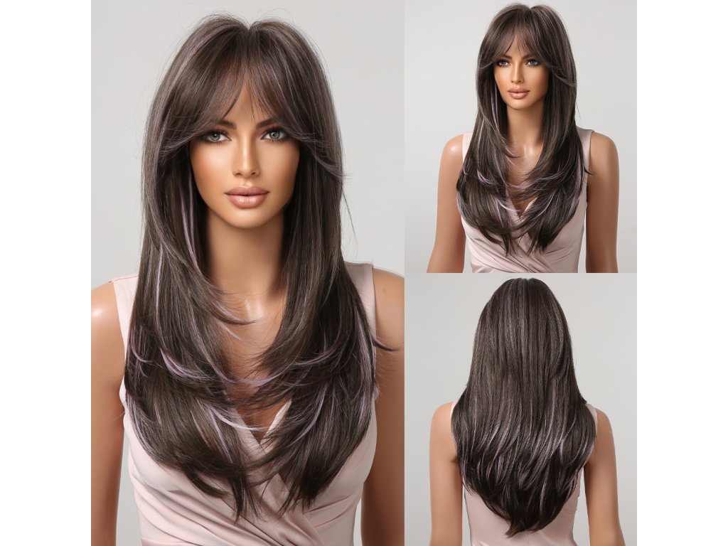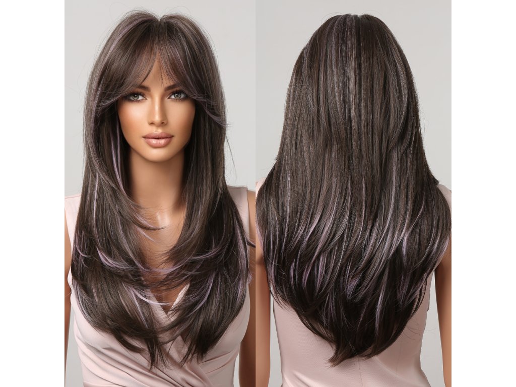 Tato paruka má dlouhé, vrstvené vlasy, které jsou převážně tmavě hnědé s jemnými fialovými melíry. Vlasy jsou elegantně zastřižené s ofinkou a hladce spadají přes ramena, což vytváří uhlazený a sofistikovaný vzhled. Celkový vzhled je moderní a elegantní, ideální pro inspiraci při hledání nového účesu nebo barvy. Tato paruka je perfektním doplňkem pro ty, kdo chtějí vypadat stylově a zároveň přirozeně. Tento styl přináší jemnou a elegantní transformaci.