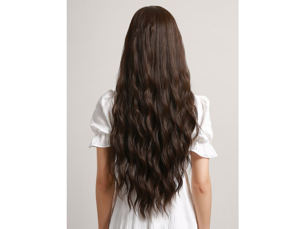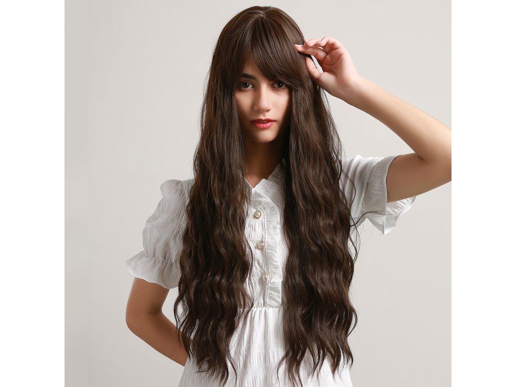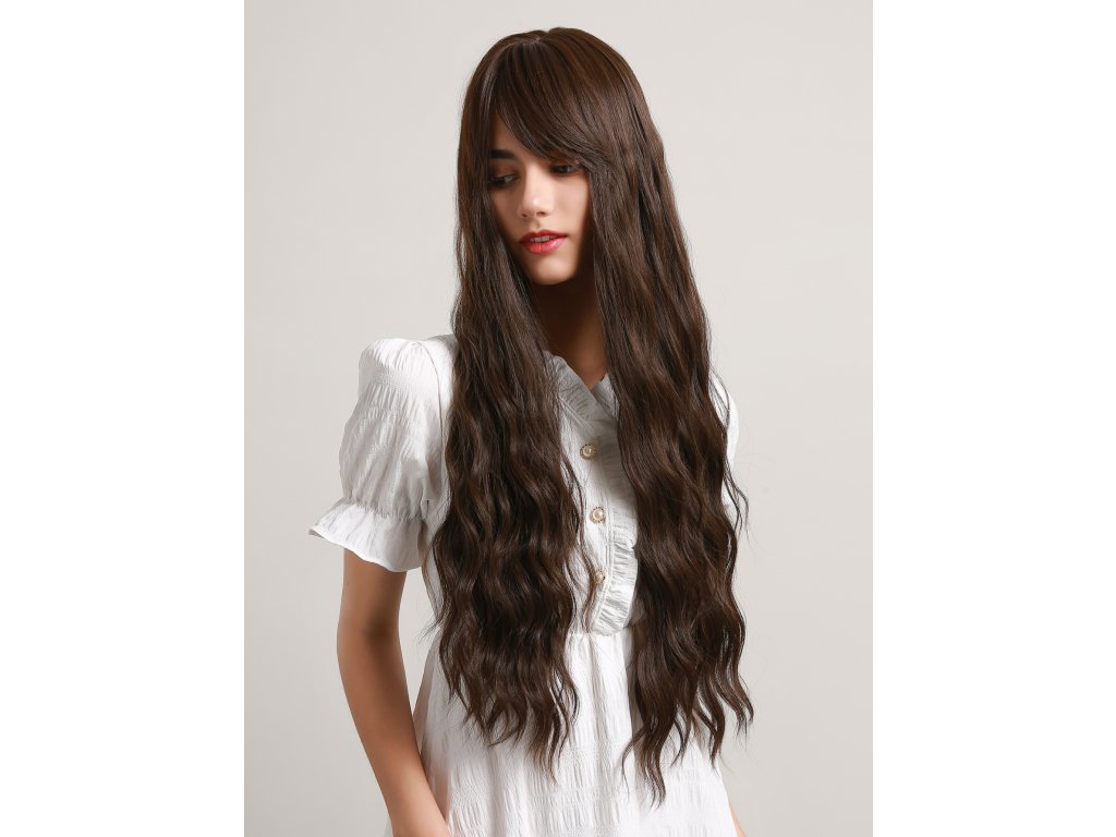 Krásná vlnitá čokoládově hnědá paruka s ofinu na obě strany. Je vyrobena z kvalitního syntetického vlákna, velice příjemného na dotek, svou jemností připomíná lidské vlasy.