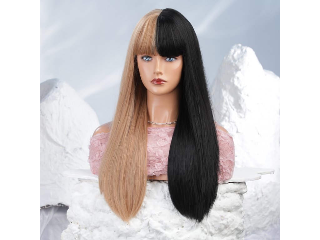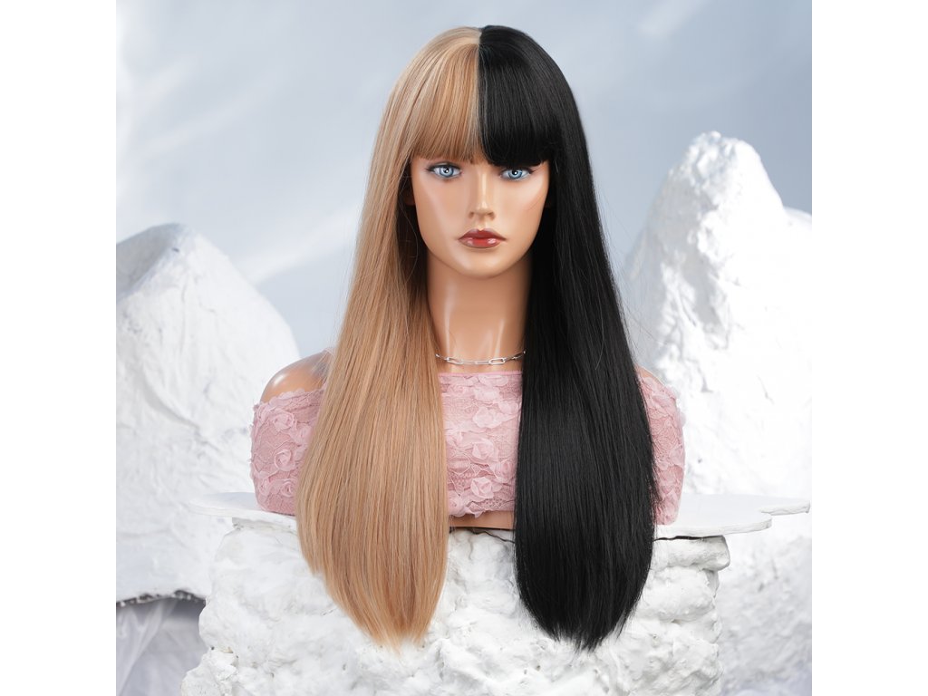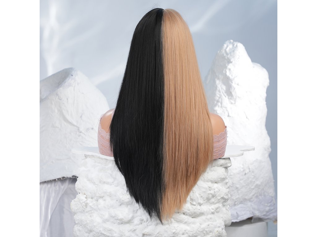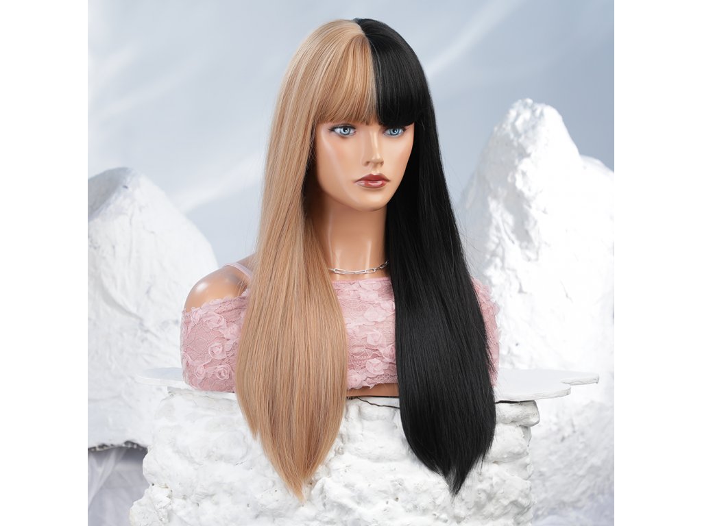 Krásná blond-černá duo paruka. Extra dlouhé rovné vlasy s ofinou. Je vyrobena z kvalitního syntetického vlákna, velice příjemného na dotek, svou jemností připomíná lidské vlasy.