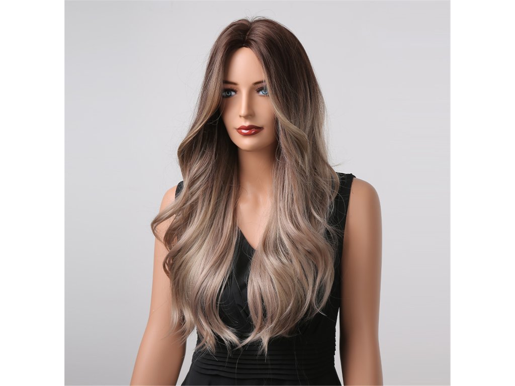 hnědá a blond barva, lehce zatočené vlasy, mikádo, ombré, ofina na obě strany, elegantní sestřih, extra lesk, syntetická paruka, působivý dojem