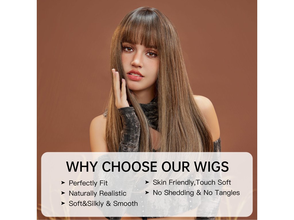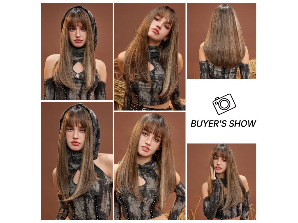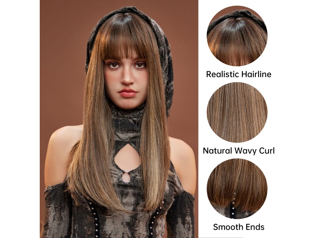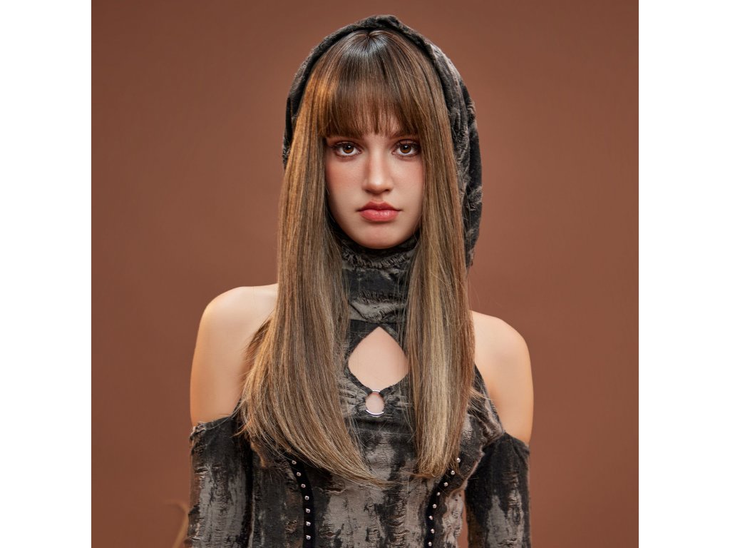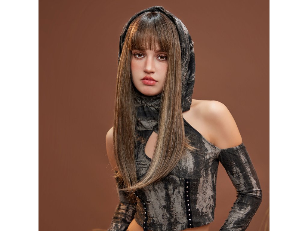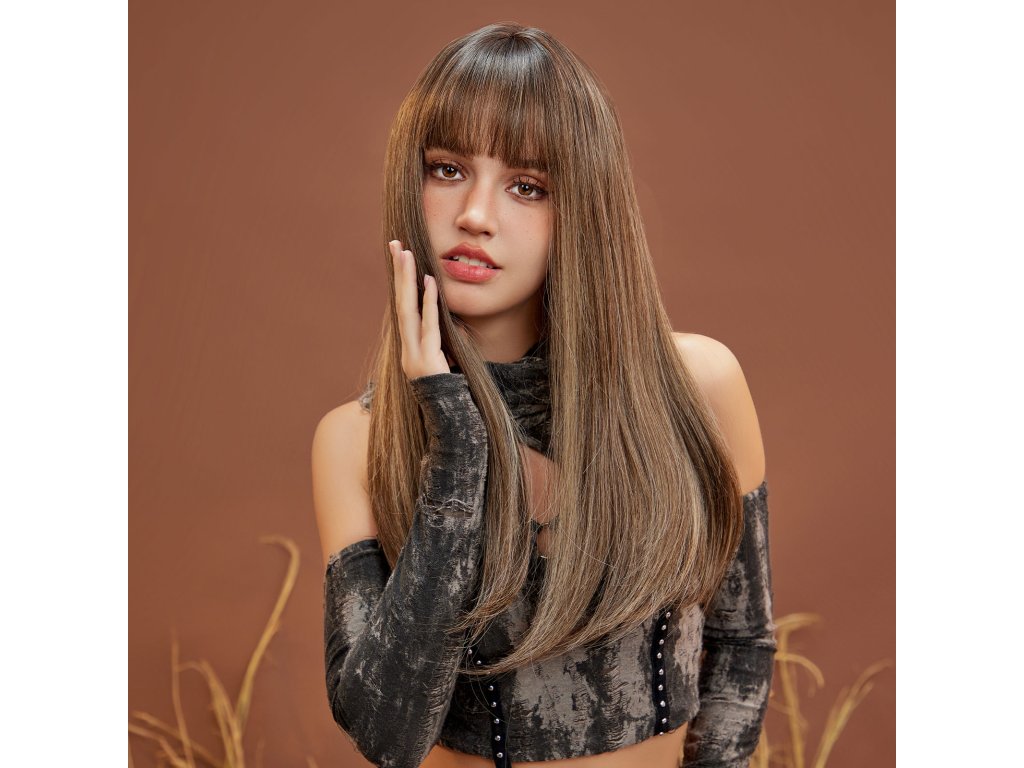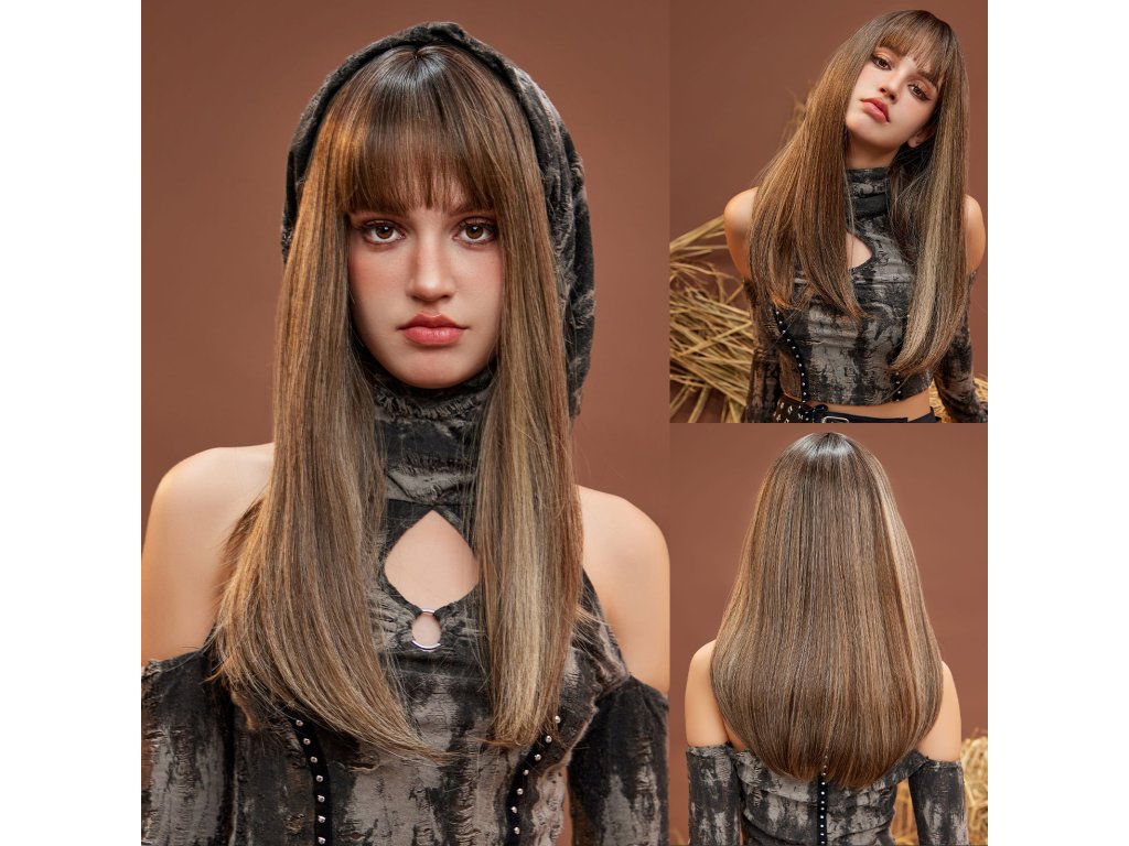 Krásná dlouhá paruka v hnědé barvě s rovnou ofinou a prosvětlenými blond pramínky. Je vyrobena z kvalitního syntetického vlákna, velice příjemného na dotek, svou jemností připomíná lidské vlasy.