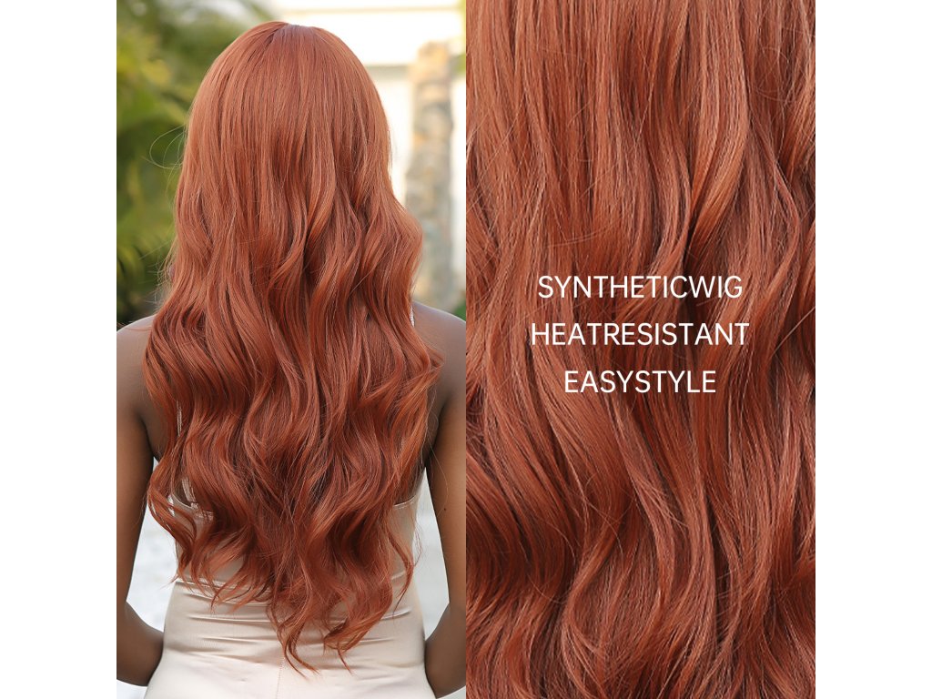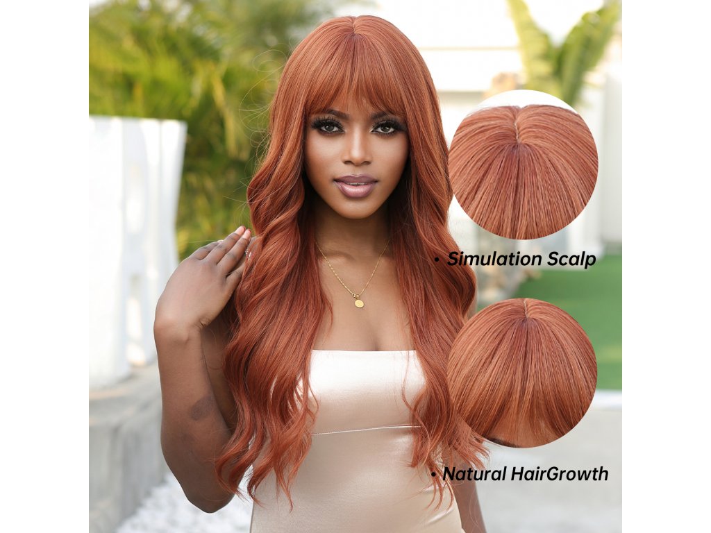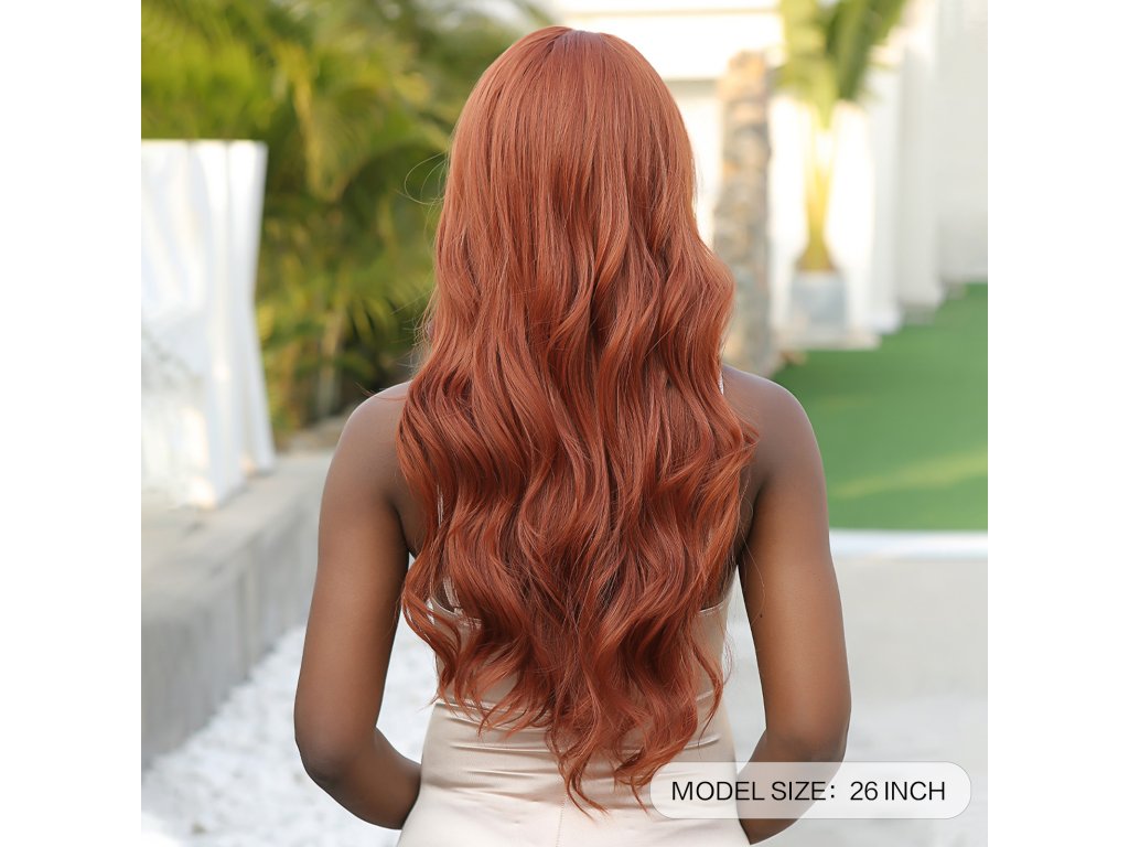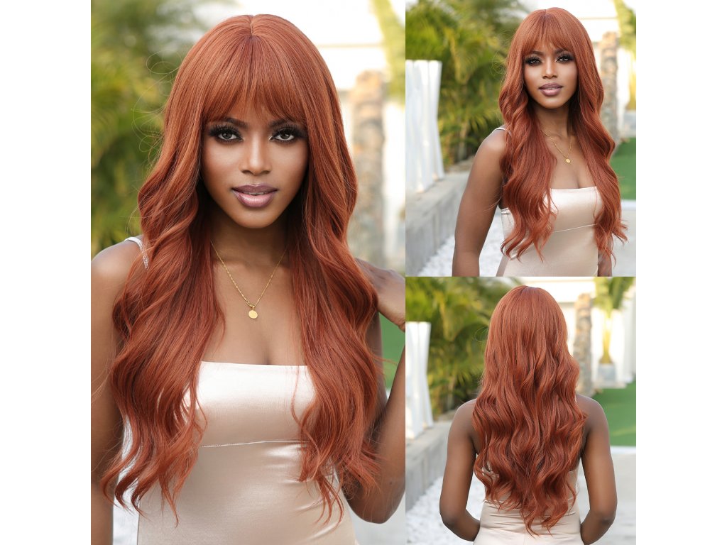 Měděně zrzavá dlouhá paruka Layla s jemnými vlnami a plnou ofinou