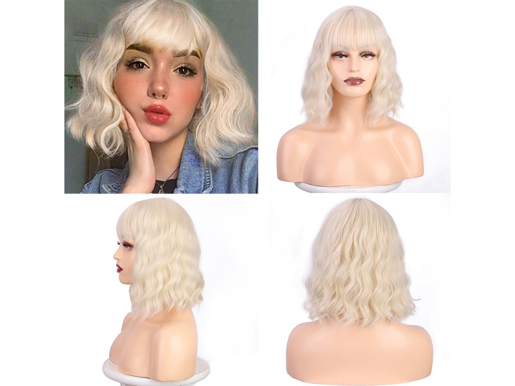 Úžasná platinová blond paruka s ofinou a s jemnými vlnami. Krátké vlasy v mikádo střihu. Je vyrobena z kvalitního syntetického vlákna, velice příjemného na dotek, svou jemností připomíná lidské vlasy.