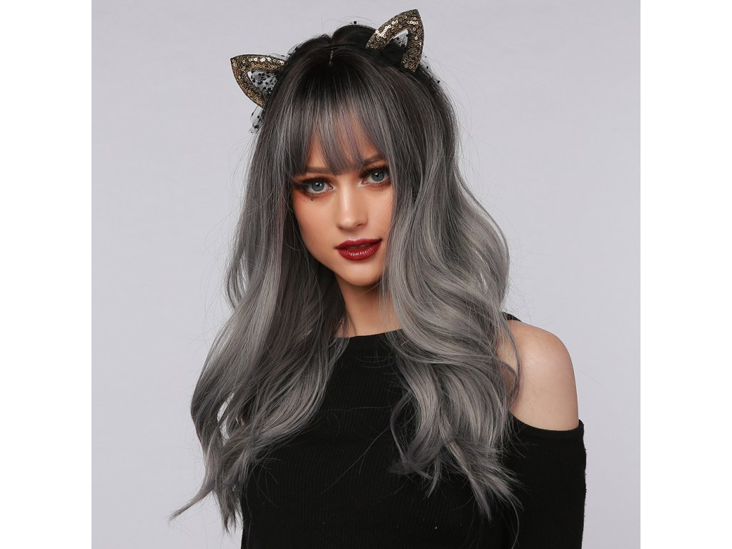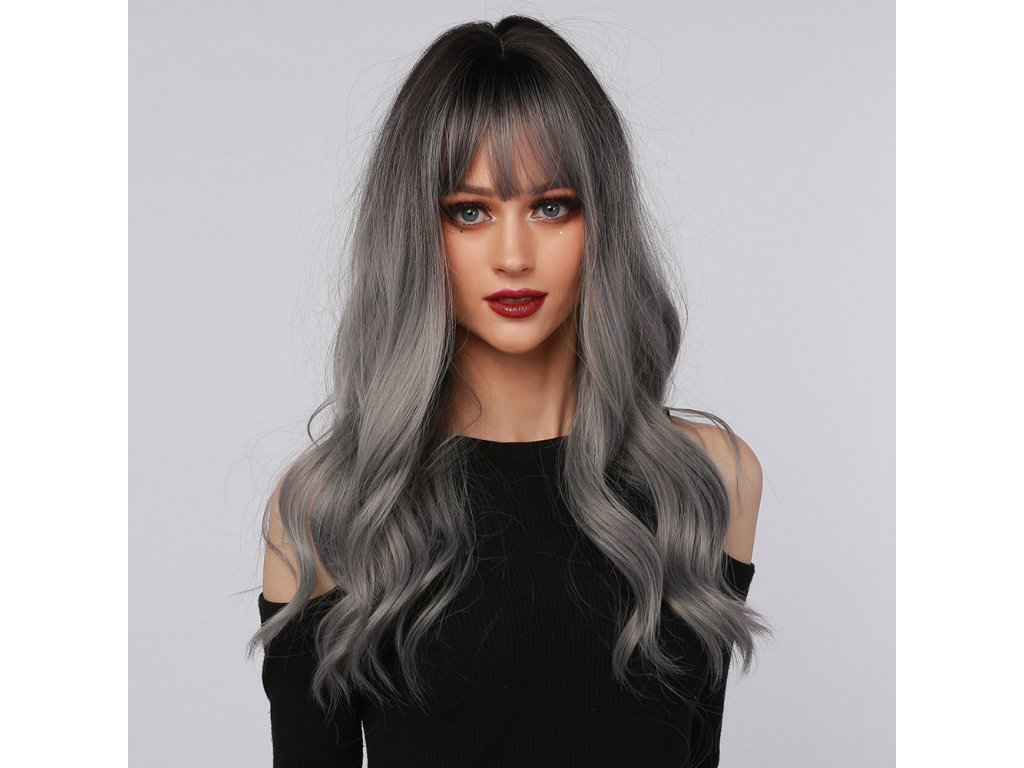 Krásná dlouhá lehce vlnitá paruka v šedé barvě s rovnou ofinou a tmavými kořínky. Je vyrobena z kvalitního syntetického vlákna, velice příjemného na dotek, svou jemností připomíná lidské vlasy.