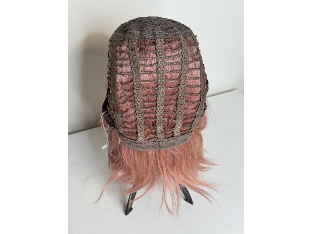 Krásná světle růžová paruka. Mikádo střih s jemnými vlnami. Je vyrobena z kvalitního syntetického vlákna, velice příjemného na dotek, svou jemností připomíná lidské vlasy.